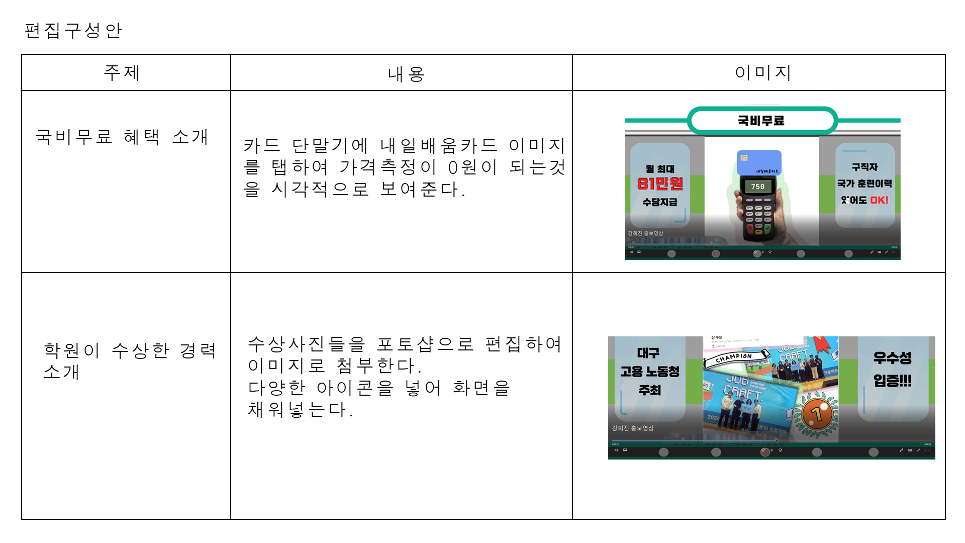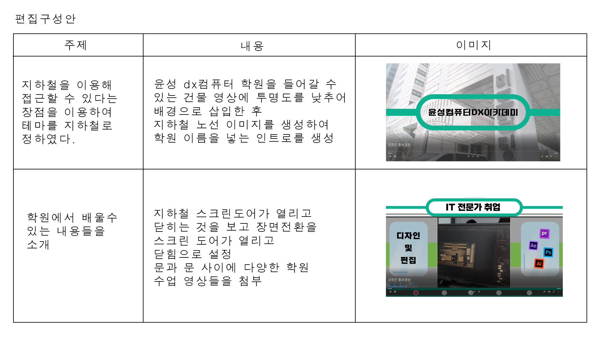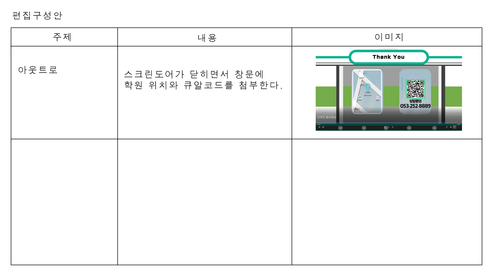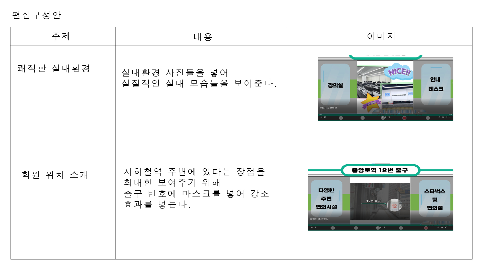 학원의 수업, 수상 경력, 수강료, 시설 등 주요 정보를 음성 없이도 쉽게 인지할 수 있도록 직관적이고 효과적인 시각 자료를 중심으로 영상을 구성하여 전달력을 높였습니다.