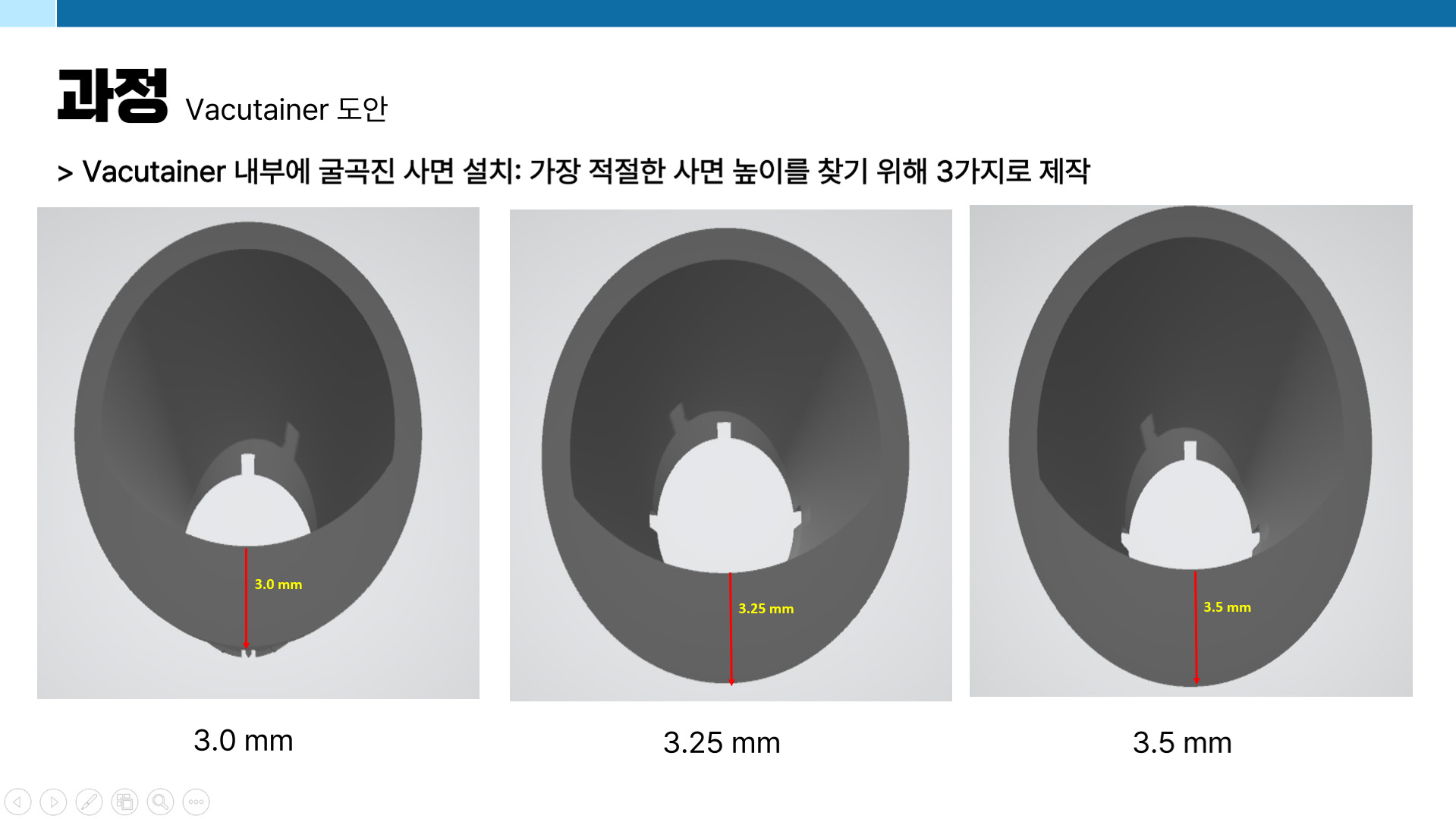 채혈을 중심으로 아이디어를 고안하였으며, 진공 채혈관 사용의 어려움을 해소할 수 있는 제품을 제작하고자 하였습니다. 아이디어를 기반으로 제품 디자인을 진행한 후, 기존 바큐테이너에 보조 사면을 추가하고 조절이 가능한 헤드를 제작하였습니다. 홀더 본체에 이격을 새겨 힘을 주면 돌아가 바늘 사면과 홀더 내부 사면을 맞출 수 있도록 하였고, 힘을 주지 않으면 돌아가지 않도록 설계하여 채혈 중 사면이 돌아가는 문제를 방지하였습니다. 또한, 애니팔 실험을 통해 채혈자 시점에서 혈액량을 확인할 수 있는 눈금을 튜브에 새겼습니다. 이를 바탕으로 수정한 도안을 전문가에게 전달하여 전반적인 평가 및 의견, 제작 의도와의 부합성, 사업성 등을 자문받은 후 1차 시제품을 제작하였습니다. 이후 시뮬레이션을 통해 1차 시제품을 보완하여 2차 시제품을 제작하고, 타 학년을 대상으로 시제품 사용 및 설문조사를 시행하였습니다.