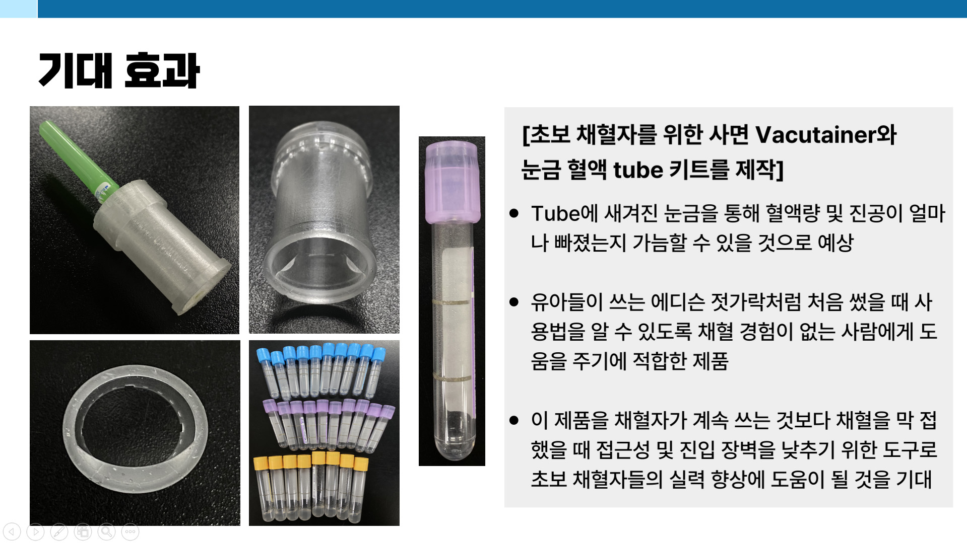 채혈을 처음 접하는 초보자를 위해 제작한 진공 채혈관 및 눈금 튜브 키트는 채혈에 대한 진입 장벽을 낮추고, 사용법을 쉽게 익힐 수 있도록 설계하였습니다. 바큐테이너 내부에 보조 사면을 설치하여 튜브 교체 시 흔들림을 최소화하고, 바늘 빠짐을 방지하고자 하였습니다. 또한, 바늘 사면과 바큐테이너 내부 보조 사면의 방향을 일정하게 유지하기 위해 헤드를 제작하여 돌려서 조절할 수 있도록 하였습니다. 아울러 사면에 튜브를 기대어 눈금을 새겨, 채혈 중 채혈자가 시점에서 검체량과 진공이 빠진 정도를 쉽게 확인할 수 있도록 제작하였습니다. 즉, 이 키트는 채혈을 처음 접하는 초보자를 위해 설계된 채혈 키트라고 할 수 있습니다.